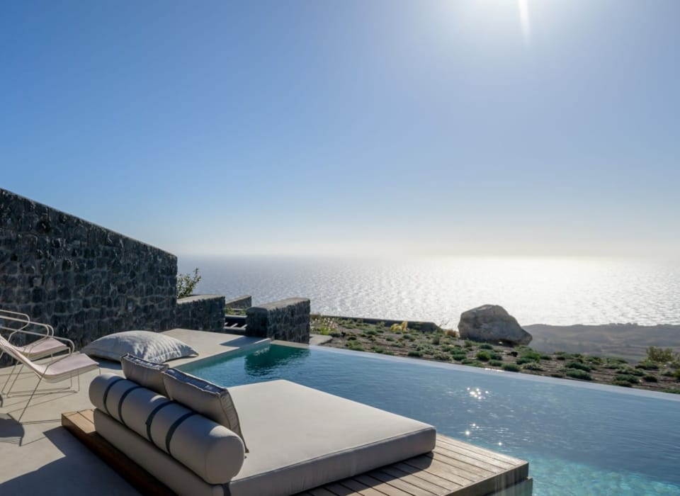 The spacious outdoor area is fitted with a built-in dining area and a heated Jacuzzi where you can enjoy your privacy and moments of pure romance in view of the indigo Aegean Sea.